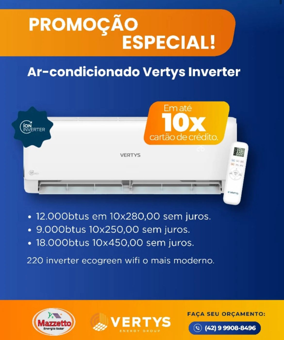 Aproveite o calor com conforto! A Mazzetto Energia Solar está oferecendo a oportunidade de adquirir seu ar-condicionado novo com condições especiais de pagamento. É possível parcelar a compra em até 10 vezes no cartão de crédito, tornando o investimento mais acessível e adequado ao seu orçamento.