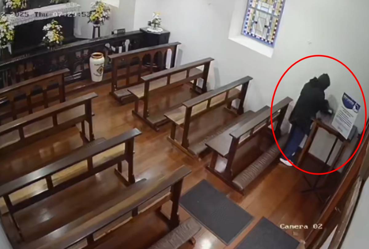 As imagens revelam que o suspeito utilizou uma cadeira para alcançar os objetos sacros. Vestindo blusa preta, calça azul e tênis branco, ele embrulhou os itens roubados em uma capa de chuva amarela antes de fugir do local. As autoridades agora buscam identificar e prender o responsável.