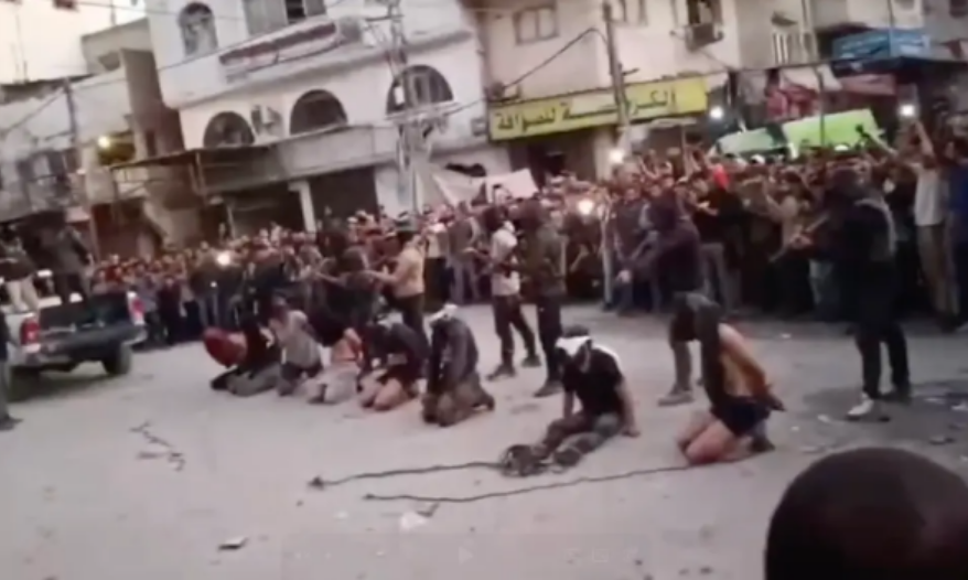 As imagens, que circulam nas redes sociais, mostram oito homens amordaçados e com os olhos vendados sendo executados sumariamente em uma rua movimentada de Gaza. Testemunhas relataram que os homens foram espancados antes da execução, e que uma multidão assistiu e, em alguns casos, aplaudiu o ato brutal.