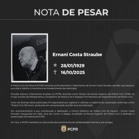 A Polícia Civil do Paraná (PCPR) lamenta profundamente o falecimento de Ernani Costa Straube, servidor que dedicou sua vida à história, à memória e ao fortalecimento da instituição.
