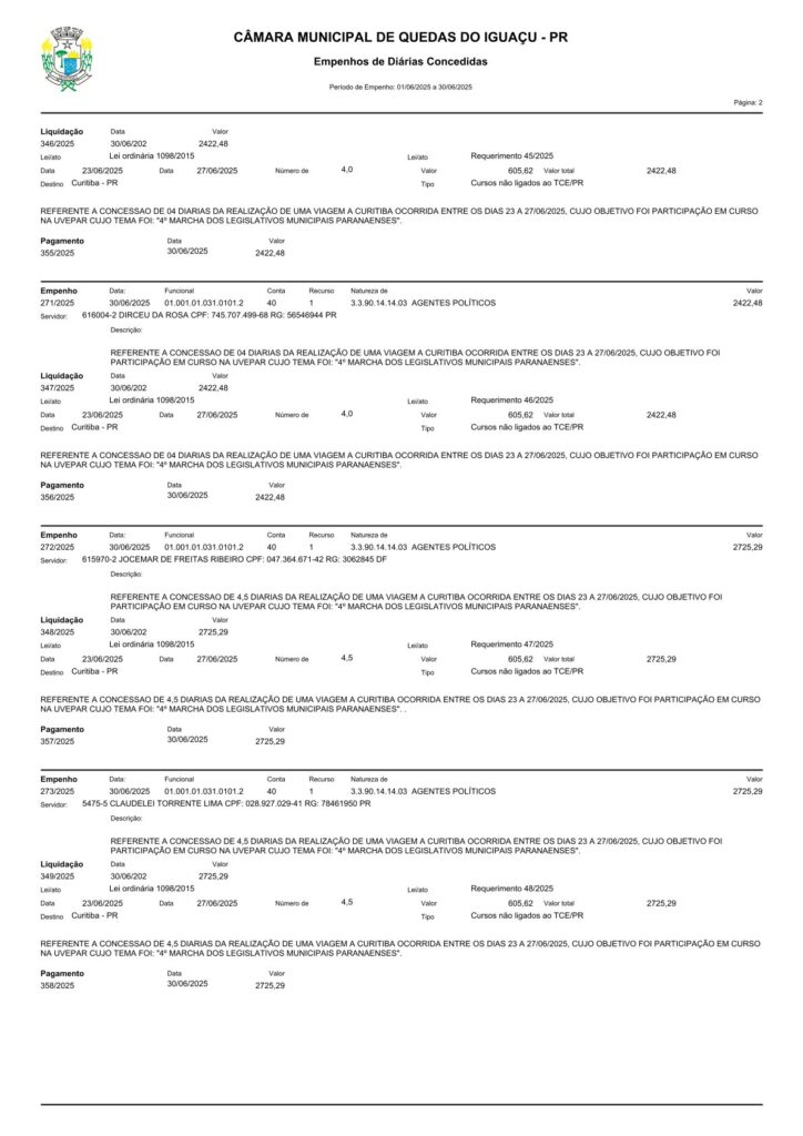 Diárias do mês de junho de 2025, alvo de polêmicas (Dados Oficiais)