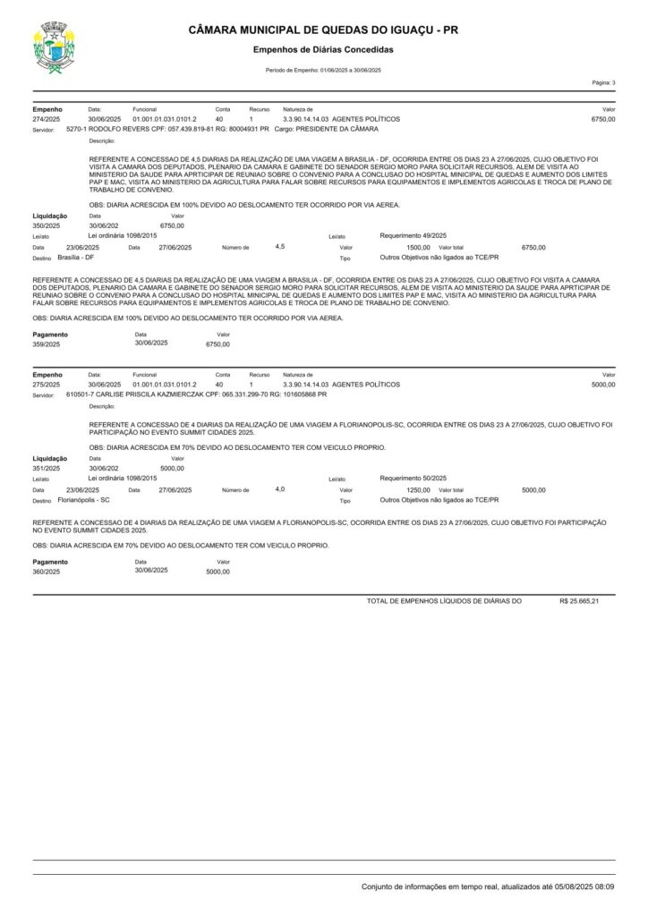 A polêmica se intensificou com a viagem da presidente Carlise a Florianópolis (SC) para participar do evento Summit Cidades 2025, entre os dias 23 e 27 de junho de 2025. O empenho registrado em documentos oficiais aponta o pagamento de R$ 5.000,00, referente a quatro diárias, com o acréscimo de 70% devido ao deslocamento ter sido realizado com veículo próprio. Na mesma semana, o presidente afastado, Rodolfo Revers, viajou a Brasília (DF), entre os dias 23 e 27 de junho, e recebeu R$ 6.750,00, referentes a 4,5 diárias, com acréscimo de 100% por deslocamento aéreo.