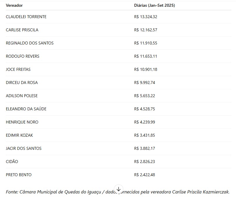 Por outro lado, dados apresentados por outros vereadores tentam confrontar que ela também teve consideráveis gastos com diárias. Porém, dados enviados pela própria presidente sobre estes gastos, no período entre janeiro a setembro de 2025, mostram o seguinte: