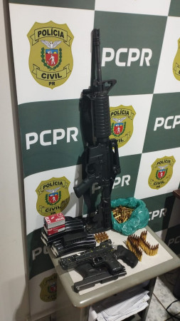No local, os policiais localizaram e apreenderam um fuzil calibre 5.56, um revólver calibre 22, uma pistola .380, 142 munições diversas e seis carregadores. O arsenal estava no apartamento e na empresa do investigado, ambos em Cambé.