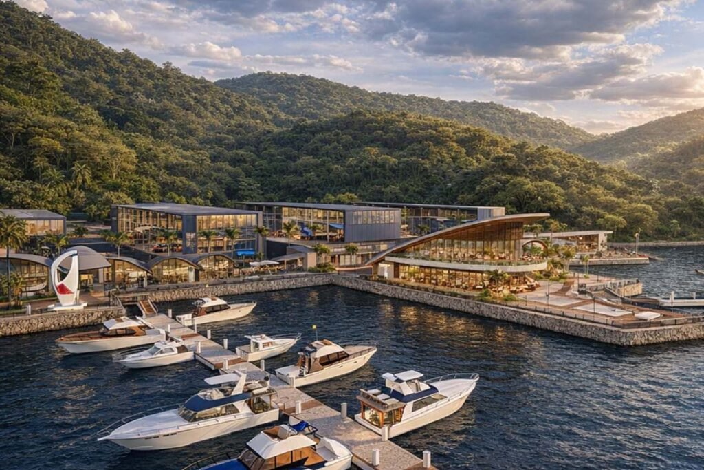 A marina, principal estrutura do empreendimento, contará com 303 vagas molhadas (para embarcações atracadas na baía) e 400 vagas secas (para embarcações alocadas internamente). Também está previsto estacionamento para 208 veículos, espaços de convivência, lazer e serviços, incluindo restaurantes, lojas e estrutura para eventos.