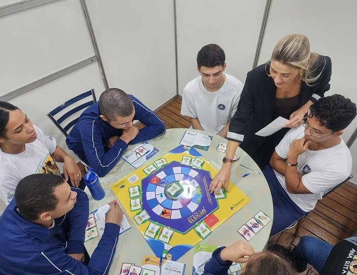 Em seguida, os alunos participaram do chamado Jogo da Democracia, uma dinâmica que simula etapas de uma campanha eleitoral. Durante a atividade, os estudantes assumiram papéis de candidatos, elaboraram propostas e enfrentaram situações como entrevistas, debates e eventos de divulgação, com o objetivo de reproduzir desafios comuns do processo político.