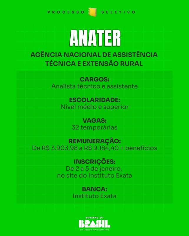 A ANATER disponibiliza 32 vagas temporárias para analista técnico e assistente, com salários de R$ 3,903 a R$ 9,184. As inscrições vão até 5 de janeiro pelo site do Instituto Exata.