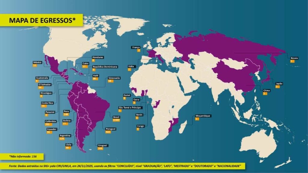 O Mapa de Egressos foi criado pela Secretaria de Comunicação Social (Secom) como espaço online para coletar e divulgar informações sobre os estudantes formados. A Unila já formou 4.600 estudantes em cursos de graduação e pós, a maioria brasileira e dos países da região, como Paraguai e Argentina.