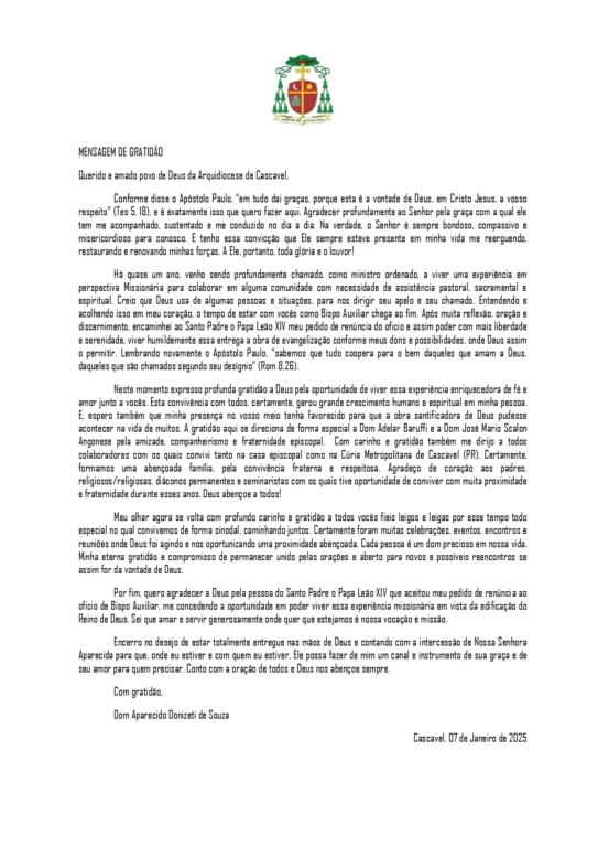 No dia 7 de janeiro de 2025, a Arquidiocese de Cascavel vivenciou um momento de transição pastoral quando Dom Aparecido Donizeti de Souza anunciou sua renúncia ao cargo de bispo auxiliar e o início de uma nova experiência missionária. Em mensagem pública, o bispo expressou gratidão ao povo da arquidiocese e compartilhou o processo de discernimento que o levou a essa decisão.