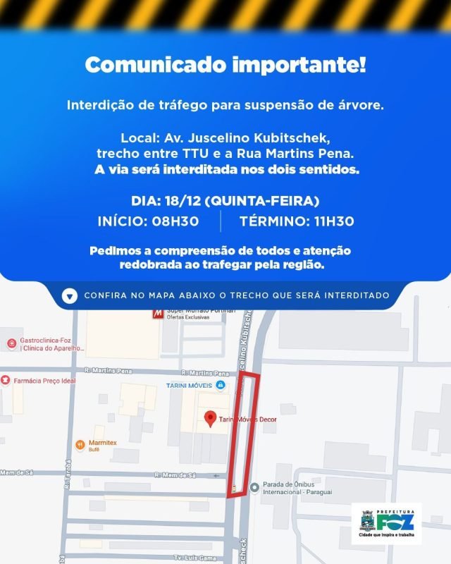 A Avenida JK será interditada nos dois sentidos nesta quinta-feira, 18, das 8h30 às 11h30, O trecho bloqueado fica entre o Terminal de Transporte Urbano (TTU) e a Rua Martins Pena.