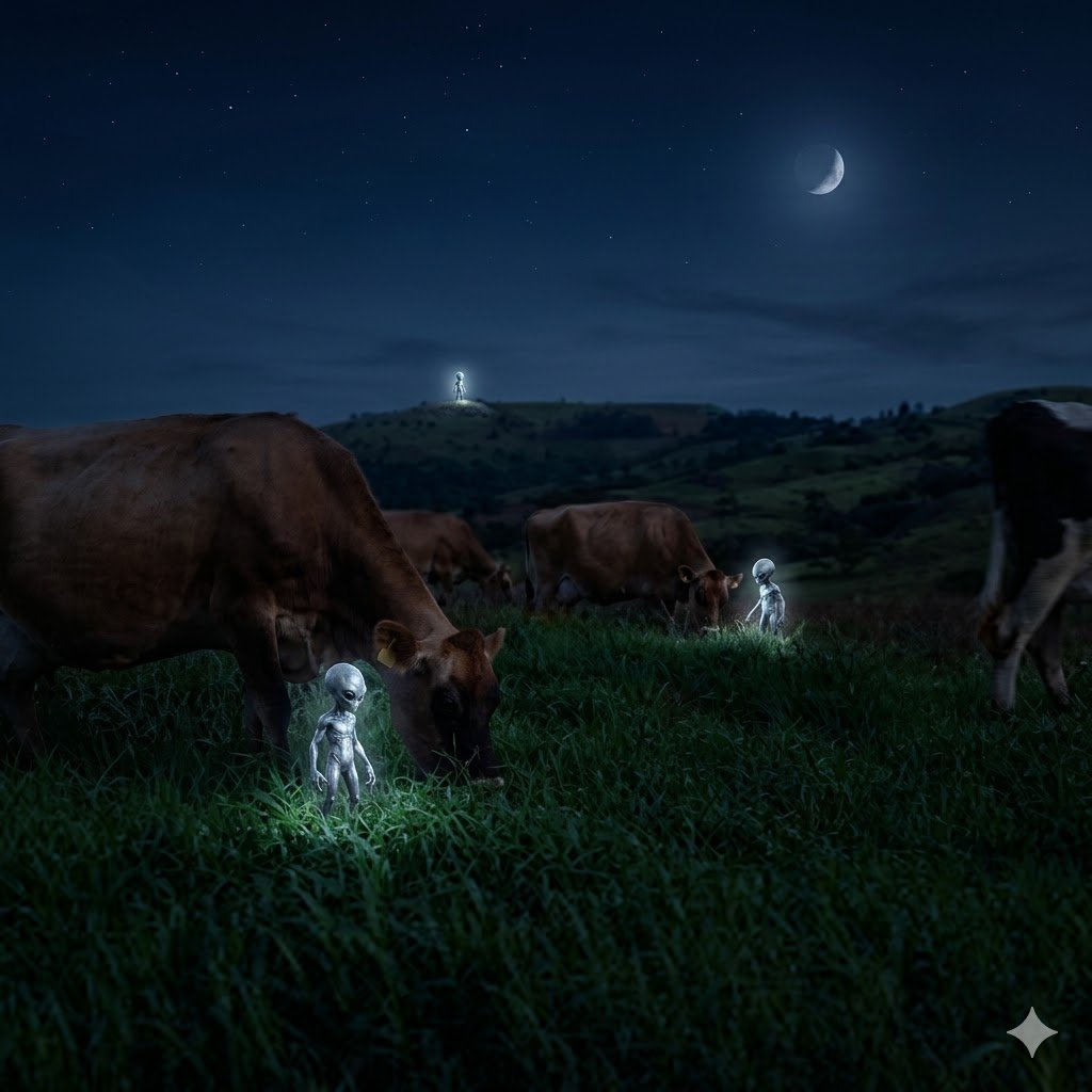 Tudo começou quando um visitante, morador de Balneário Camboriú, afirmou ter fotografado supostos seres extraterrestres caminhando à noite entre o gado. Segundo informações, a imagem rapidamente se espalhou em grupos esotéricos — e até entre “urologistas” (ou seria ufólogos?) — gerando curiosidade e debate.