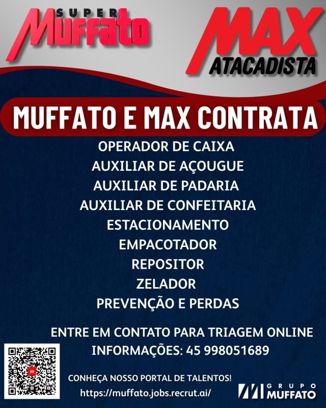O Grupo Muffato, um dos maiores empregadores de Foz do Iguaçu, abriu o ano com vagas de emprego em nove funções nas unidades Super Muffato e Max Atacadista. Além disso, os proprietários de veículos já podem emitir guias de pagamento do IPVA 2026.