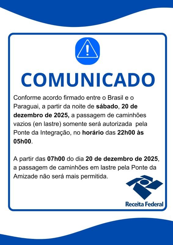 A Receita Federal comunicou que a passagem de caminhões em lastro pela Ponte da Amizade não é mais permitida a partir das 7h deste sábado. No lado brasileiro, a Ponte da Integração foi aberta oficialmente pelo presidente Luiz Inácio Lula da Silva em solenidade na sexta-feira, 19, acompanhado do diretor-geral da Itaipu Binacional, Enio Verri, e de autoridades federais e municipais.