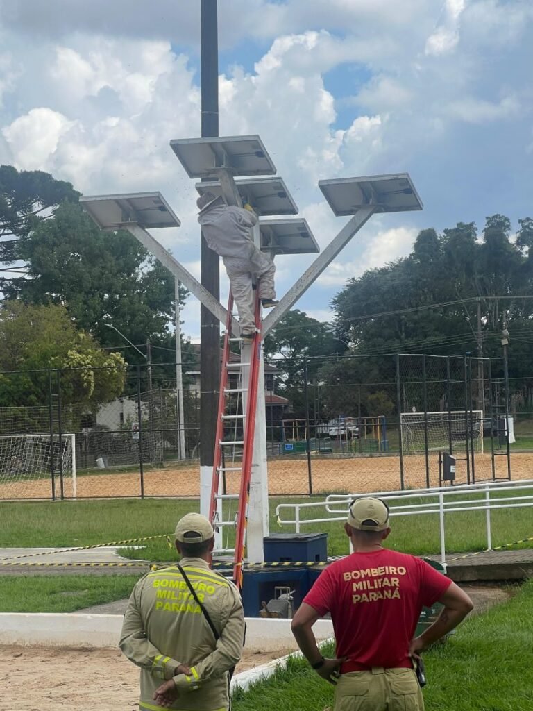 O Corpo de Bombeiros realizou, neste domingo (8 de março de 2026), a interdição temporária do parquinho do Parque das Crianças em Guarapuava devido à presença de um enxame de abelhas no local.