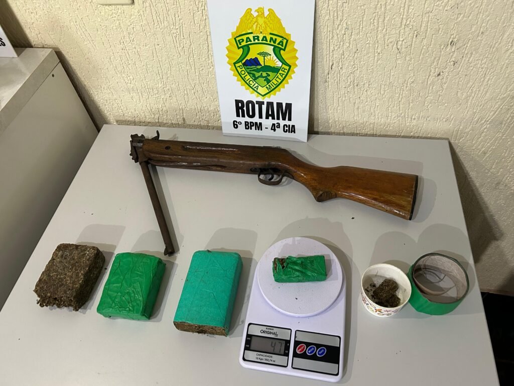 A equipe policial, após receber denúncias sobre tráfico na região, intensificou patrulhamento ostensivo no local informado e conseguiu a abordagem. Durante a diligência, foram apreendidos cerca de 835 gramas de substância análoga à maconha, uma balança de precisão, R$ 69,00 em dinheiro, embalagens usadas para acondicionar o entorpecente e uma arma de fogo calibre .22.