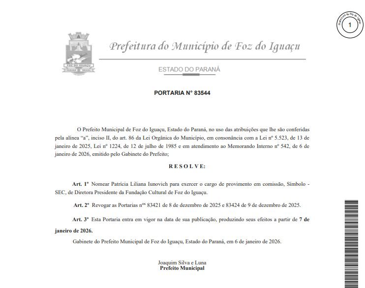 O prefeito Joaquim Silva e Luna nomeou a jornalista Patrícia Iunovich como diretora-presidente da Fundação Cultural de Foz do Iguaçu, substituindo a interina Angelita Hanauer. Também nomeou Raphael Augusto Dotto como diretor de Projetos e Captação de Recursos Culturais, em substituição a Leilane Dalla Benetta.