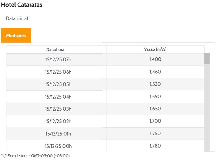 Na segunda-feira, Foz do Iguaçu registrou 24 °C às 8 h e previsão de pancadas de chuva com 6,4 mm de acumulado. O Simepar indica maiores chuvas na terça, 15,4 mm, e mínima de 16 °C na quarta. O Climatempo prevê máximas de 31 °C na semana, enquanto a Metsul estima mínima de 14 °C na quarta e máximas de 33 °C na sexta e sábado. A vazão nas Cataratas do Iguaçu estava em 1.400 m³/s às 7 h, abaixo do referencial de 1.500 m³/s.
