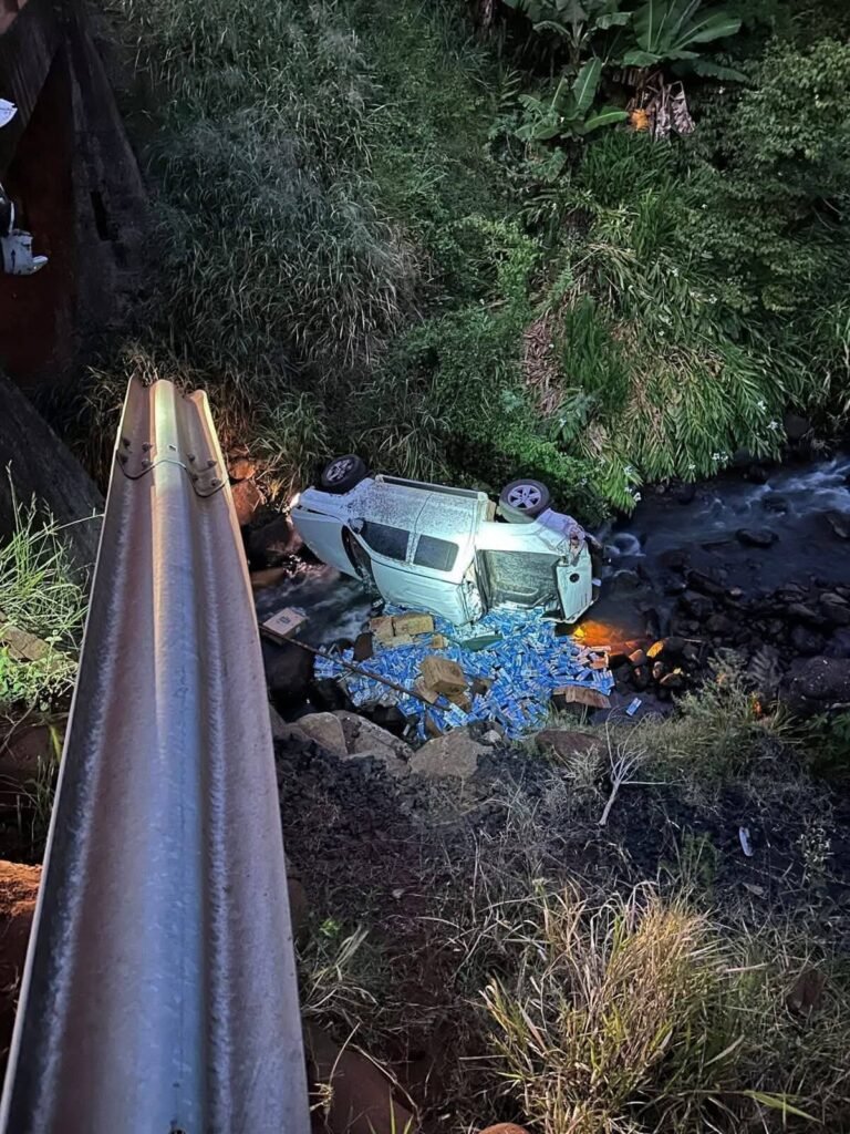 A fuga terminou quando a Amarok entrou em uma estrada vicinal e, ao cruzar uma pequena ponte, saiu da pista, rompeu o parapeito e caiu no rio. O resultado: cerca de 13 mil maços de cigarros espalhados pela água, prejuízo ao patrimônio público, dano ambiental e um motorista que abandonou o carro e sumiu na mata fechada.