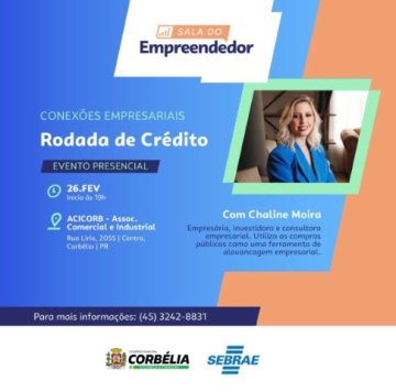 A Sala do Empreendedor de Corbélia realiza no próximo dia 26 de fevereiro a Rodada de Crédito – Conexões Empresariais, um evento voltado a empresários, microempreendedores individuais (MEIs) e pessoas que desejam expandir seus negócios no município.