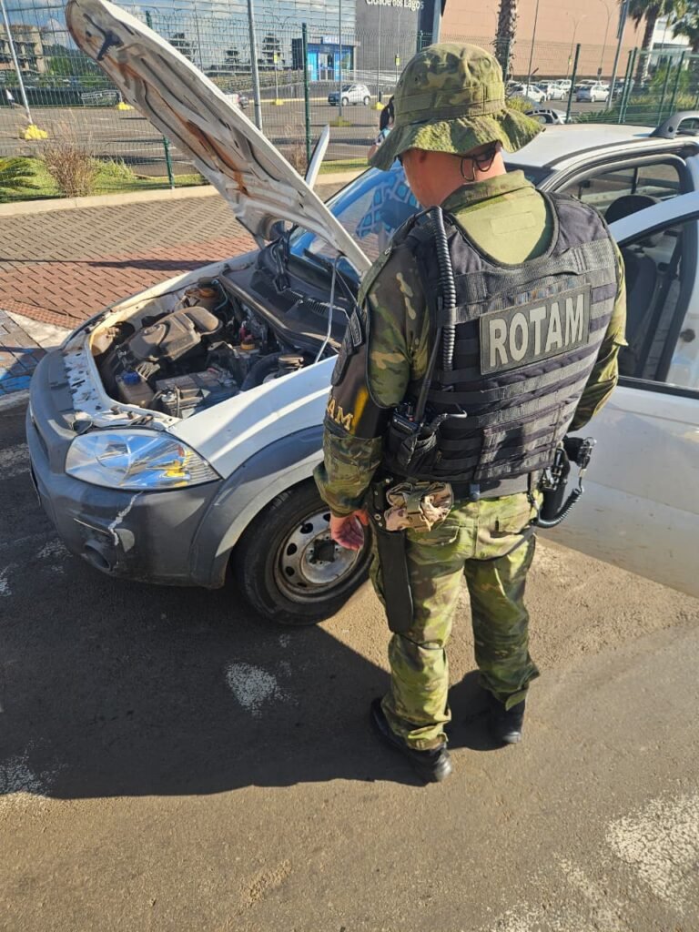 Nesse sábado (4 de abril de 2026), uma equipe ROTAM da 4ª Companhia da Polícia Militar Ambiental, em patrulhamento pela BR-277, em Guarapuava, recebeu informações via COPOM de que o sistema de monitoramento “Olho Vivo” havia identificado um veículo clonado circulando no município.